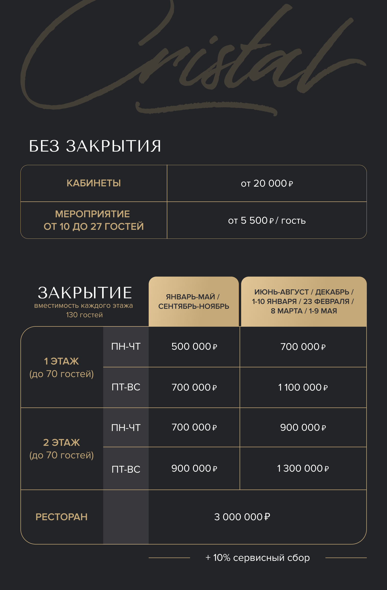 Приглашаем Вас провести время в уютных залах Cristal, где интерьер с элементами ар-деко создаёт атмосферу изысканности.